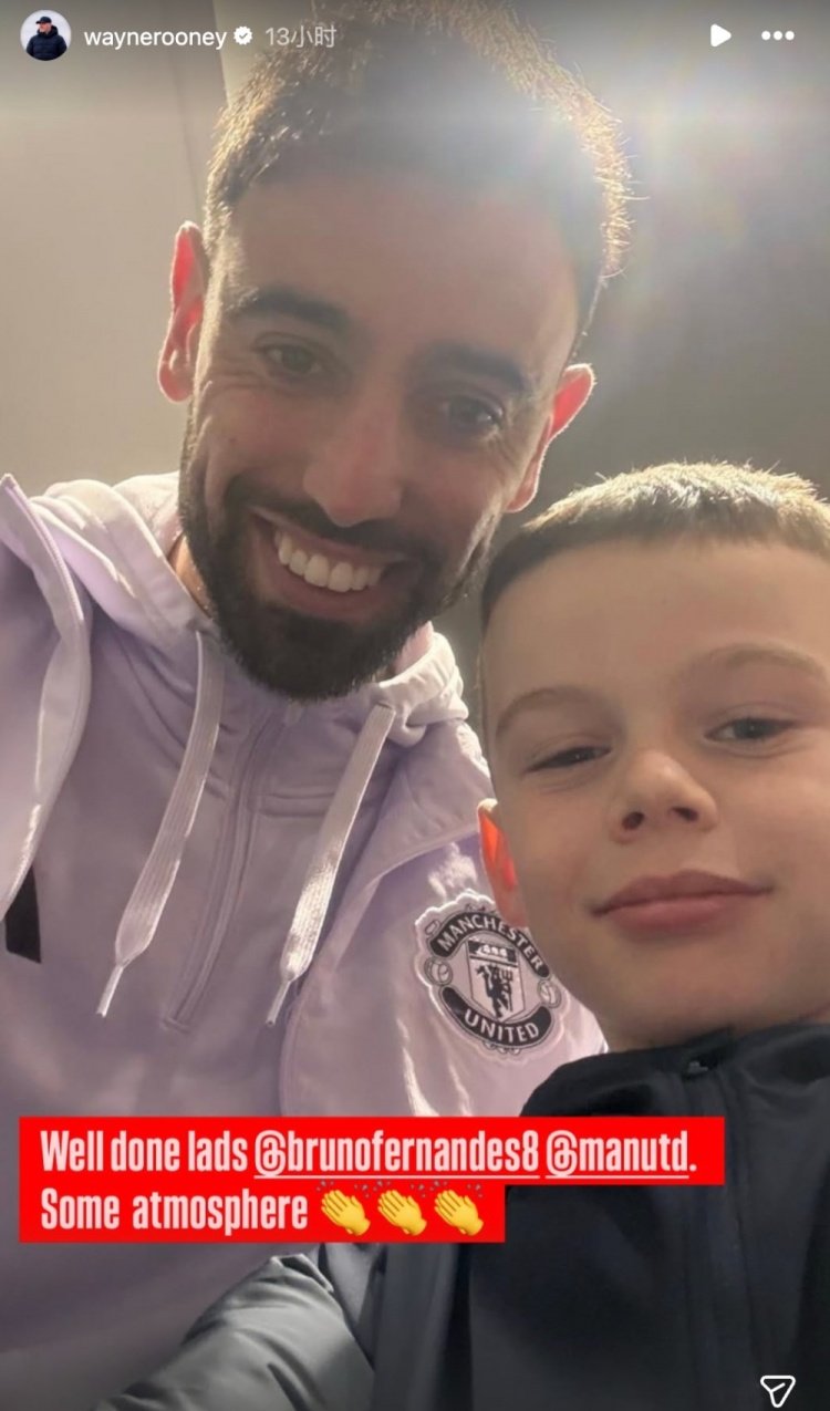 赛后,鲁尼通过社媒晒出小儿子与B费的合照,并配文写道:干得漂亮,伙计们@布鲁诺·费尔南德斯 @曼联。现场氛围太棒了????????????